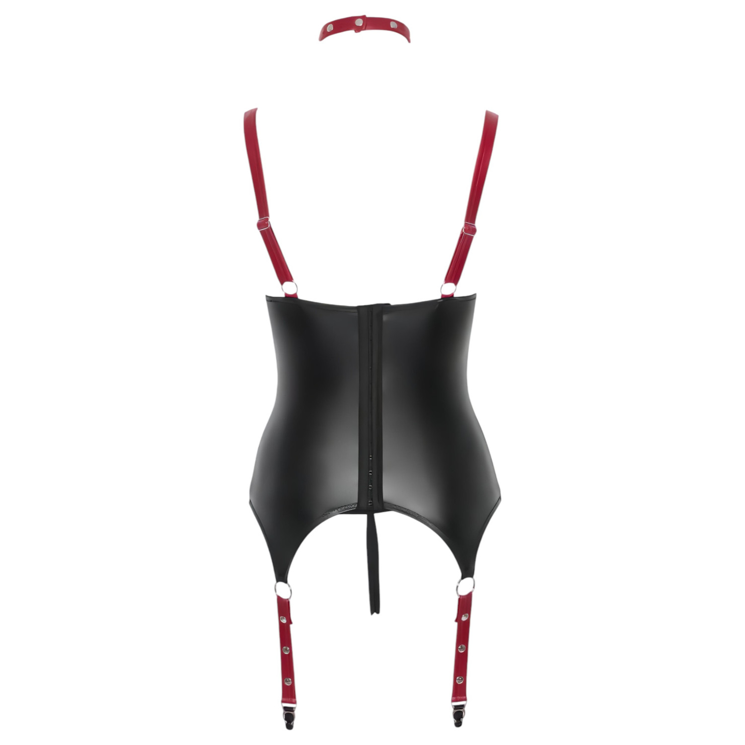 Viliojantys raudoni dirželiai, blizgi juoda medžiaga ir kniedėmis puoštos detalės - šis apatinio trikotažo rinkinys tobulu balansu derina viliojimą ir dominavimą.