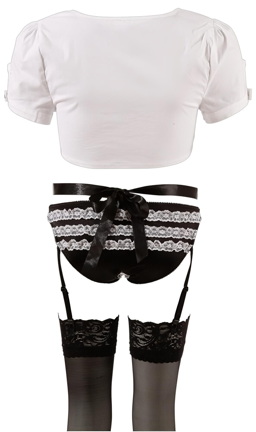 • Juodos nėriniuotos kojinės, balti mygtukuoti apykaklė, kepuraitė su lankeliu bei prijuostė su balta nėrinių apdaila ir juodu satino diržu - viskas, ko reikia pilnam vaidmenų žaidimų įvaizdžiui.