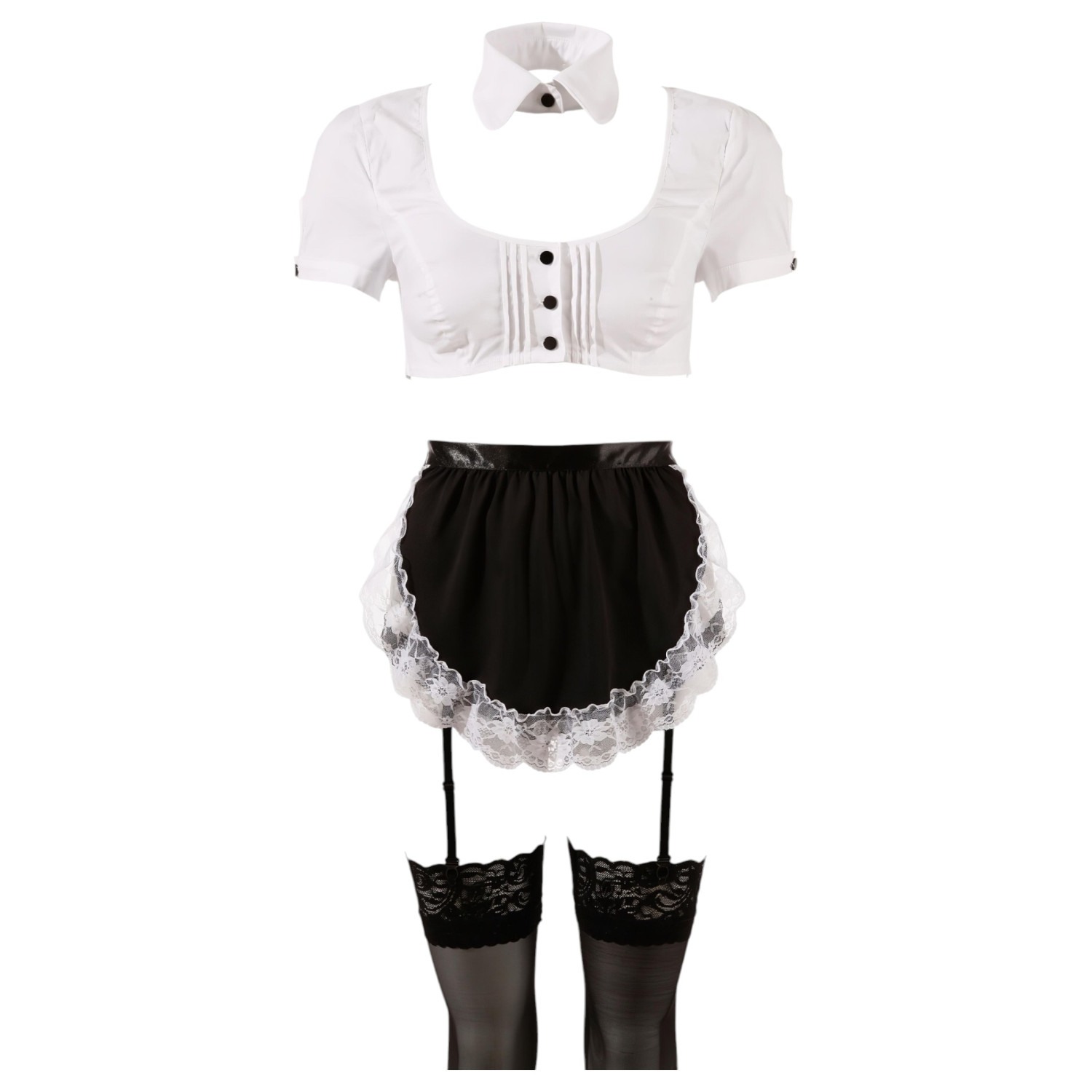 • Juodos nėriniuotos kojinės, balti mygtukuoti apykaklė, kepuraitė su lankeliu bei prijuostė su balta nėrinių apdaila ir juodu satino diržu - viskas, ko reikia pilnam vaidmenų žaidimų įvaizdžiui.