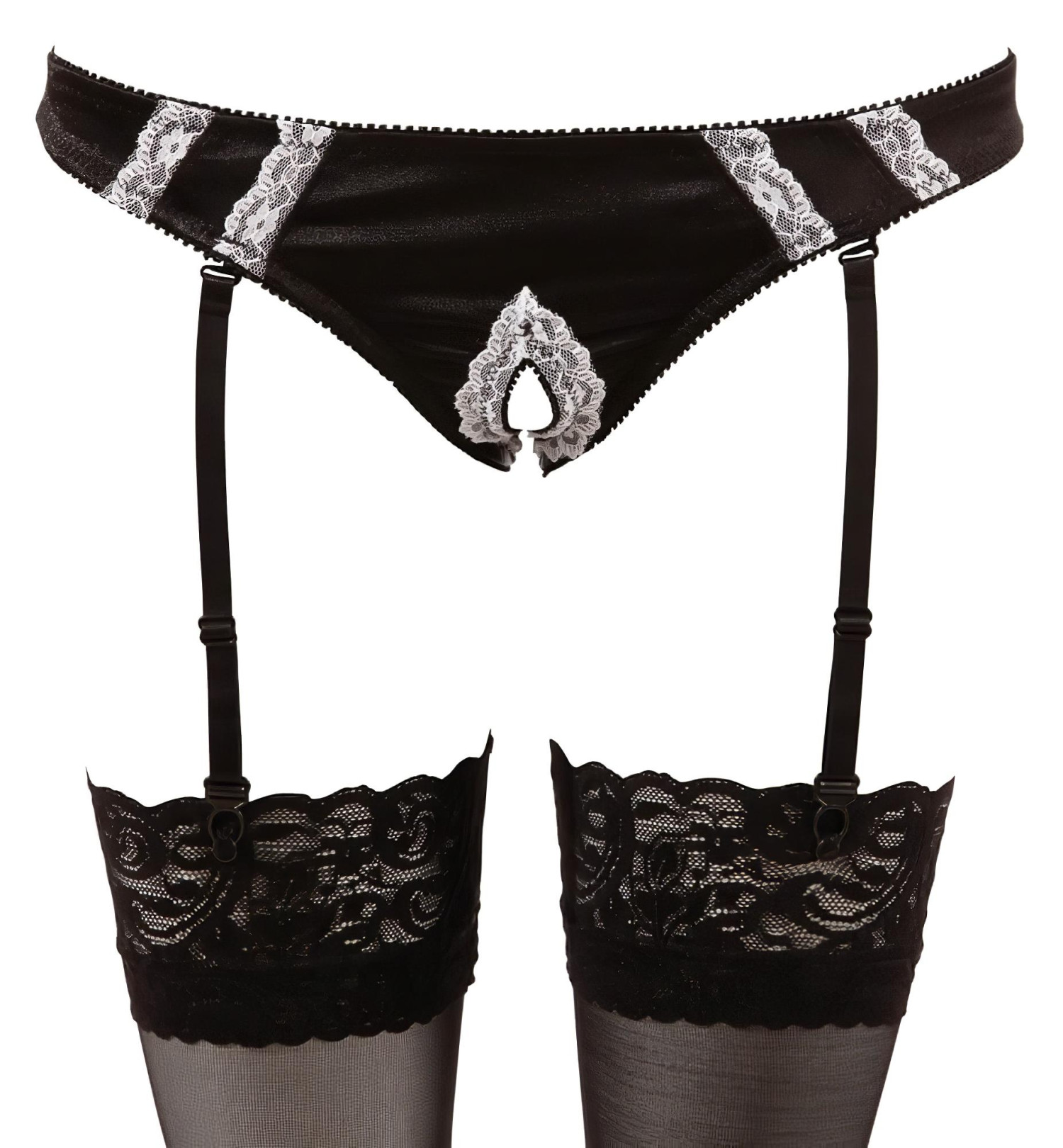 • 1 vnt. juodo satino prisegamų kojinių kelnaitės su raukinukais, baltos nėriniuotos detalės, atvira ties intymiąja vieta