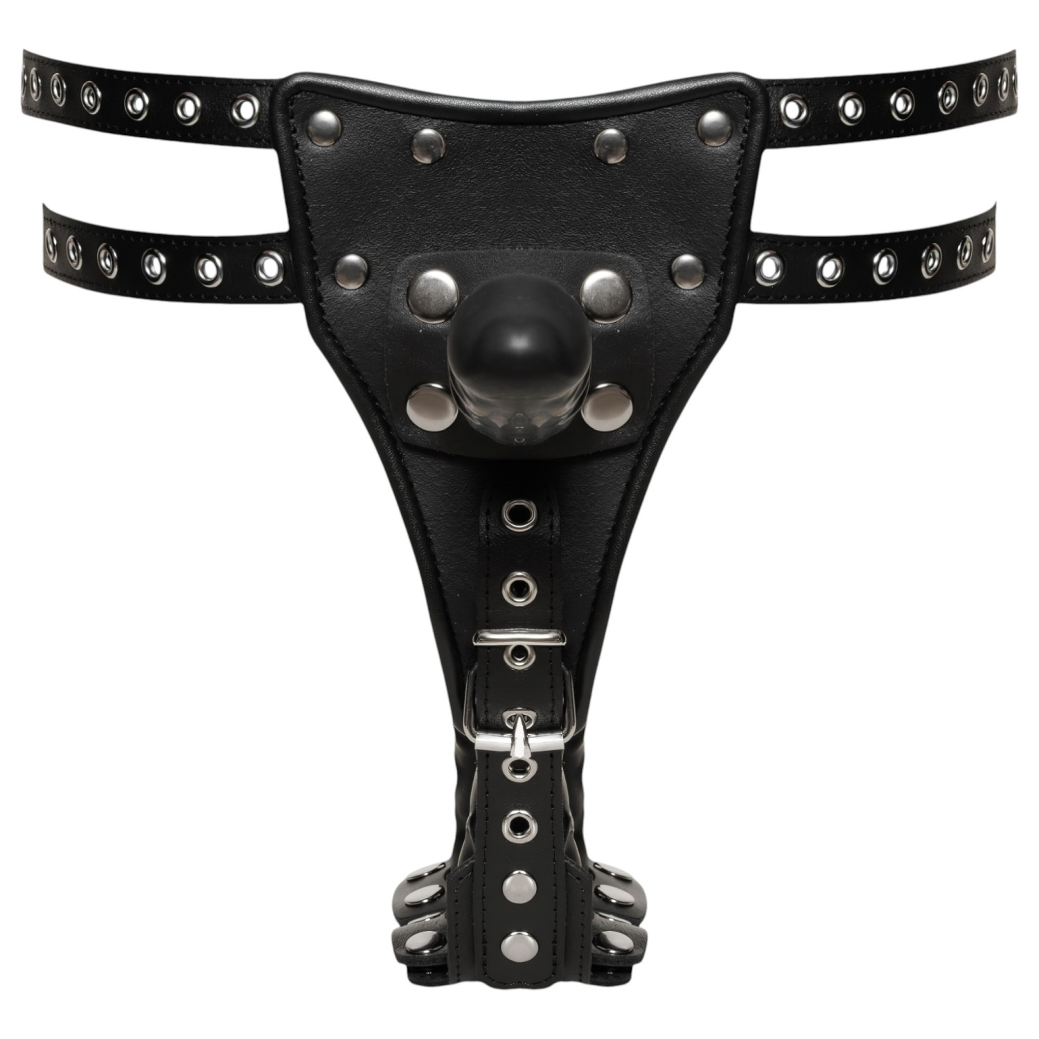 • Medžiagos: metalas, natūrali oda (dirželis apačioje), 100% lateksas (dildo)